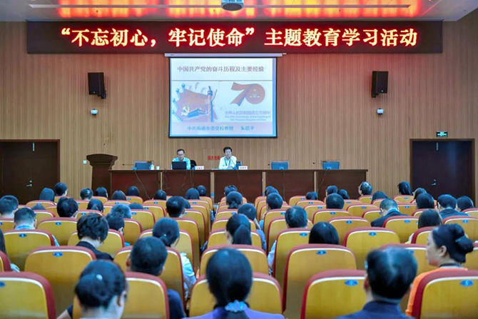 根据“不忘初心、牢记使命”主题教育集中学习研讨专项工作安排,10月8日下午,学校特邀中共南通市委党校朱联平教授为全体党员专题讲座,讲座主题为“中国共产党的奋斗历程及主要经验”。学习活动由校长、党委副书记季仲平主持。