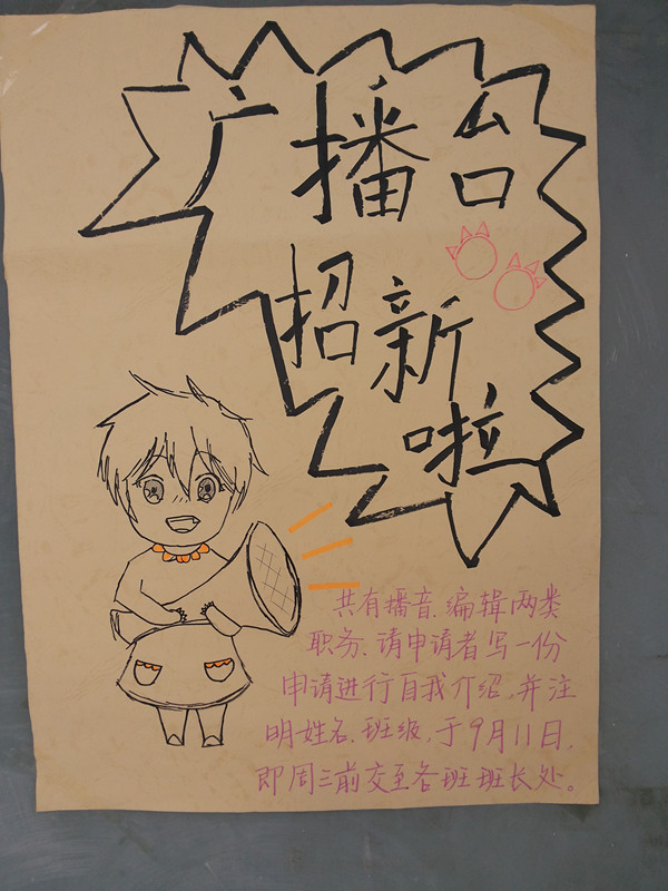 开学两周来,我校学生会各部在高一年级纷纷发起招新宣传,计划招募一些热爱学生自我管理工作、有才艺特长、有组织能力的同学加入学生会大家庭。