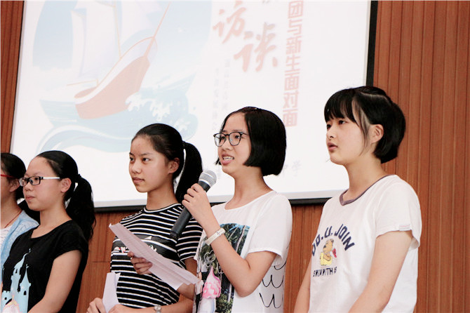 随后,现场的6位我校2016届优秀毕业生和2名高三学生代表就自己的高中经验和高一新生分享他们的心得体会。他们分别是就读于山东大学计算机科学与技术系的王秋阳同学,上海交通大学的许可同学,北京大学历史系的李祎雯同学,华东师范大学数学系的张瑞潇同学,同济大学软件工程学院季哲希同学,中央民族大学应用统计学系的曹晨曦同学以及在校生高三(5)吴宗宇同学,高三(9)张晨同学。这些学长学姐们与新生共话如何设立目标与心理调节,并就高中生活谈及了住宿生活与个人兴趣培养。学长们也毫不吝啬的向高一同学分享了自己的学习方法,并且阐述了学习与社团的平衡关系。相信各位高一学弟学妹在听完学长们的讲述后,一定对将来的高中生活充满信心。