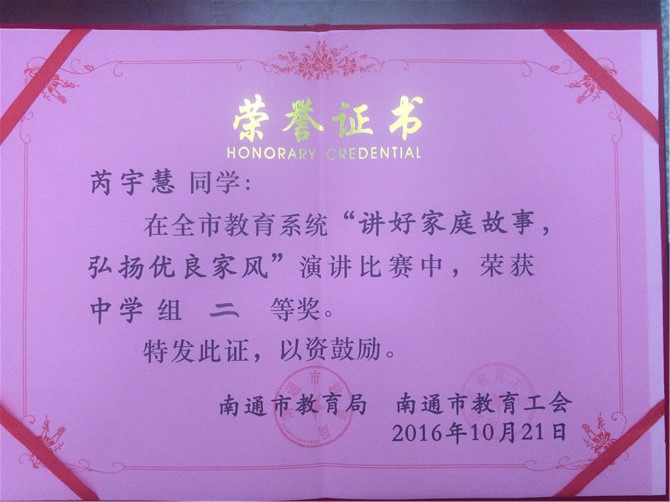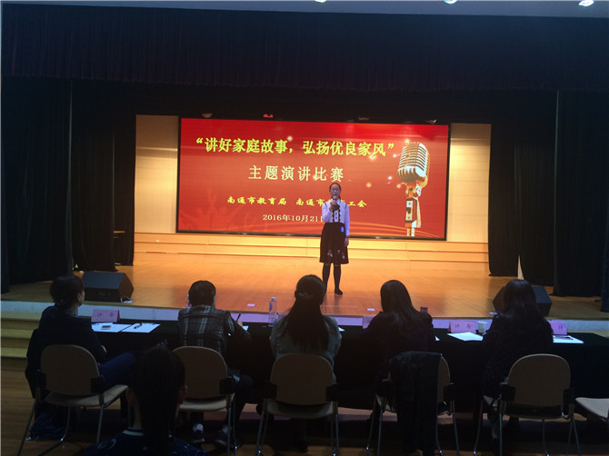 家风,是一个家庭或家族的传统风尚。家训,是指对子孙立身处世、持家治业的教诲。好的家风、家训是中华民族传统美德的传承,是立身做人的行为准则,是社会文明和谐的基础。10月21日,我校高一2班芮宇慧同学代表我校参加南通市“讲好家庭故事,弘扬优良家风”主题演讲比赛,荣获二等奖;同时,通州区小学组,中学组,教师组,教师组综合排名第三名,荣获团体第三名的好成绩。芮宇慧同学的演讲主题围绕“全国最美中学生”徐爱明的故事展开,优良的家风家教造就了徐艾明的“最美”;一家人的大孝至爱,感动了社会;家人与社会的关爱给了他知恩图报、发奋进取的动力。家风与育人,家庭与社会的互动共生,如此精彩的演绎,感人至深,发人深醒!(图文:校团委)