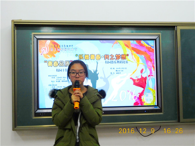 12月9日下午16 :10分,我校第十届校园艺术节系列活动——“青春品质”为主题的校园十佳歌手比赛在躬习楼阶梯教室举行,共76名选手参赛,校文艺部7名成员担任评委。