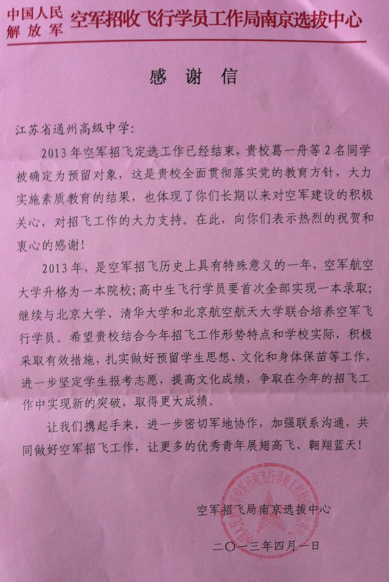 空军招飞局向我校发《感谢信》 时间:2013-04-18 来源:教务处 浏览:次 分享到: 2013年空军招飞定选工作已经结束,我校高三(7)班葛一舟、高三(3)范华瑶两同学经过层层选拔,被确定为预留对象。日前,中国人民解放军空军招收飞行学院工作局南京选拔中心向我校发来《感谢信》。 打印正文 关闭本页 扫一扫关注通州高级中学
