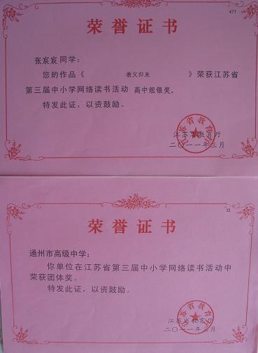 我校网络读书活动获大奖 时间:2011-09-08 来源:本站原创 作者:佚名 浏览:次 分享到: 我校网络读书活动获大奖 由江苏省教育厅组织的第三届中小学网络读书活动中,我校成绩斐然,26名同学获奖,其中陈桦、吴一鸣同学荣获金奖。赵晓莉、从晓获优秀指导教师奖,学校获得团体奖。 打印正文 关闭本页 扫一扫关注通州高级中学