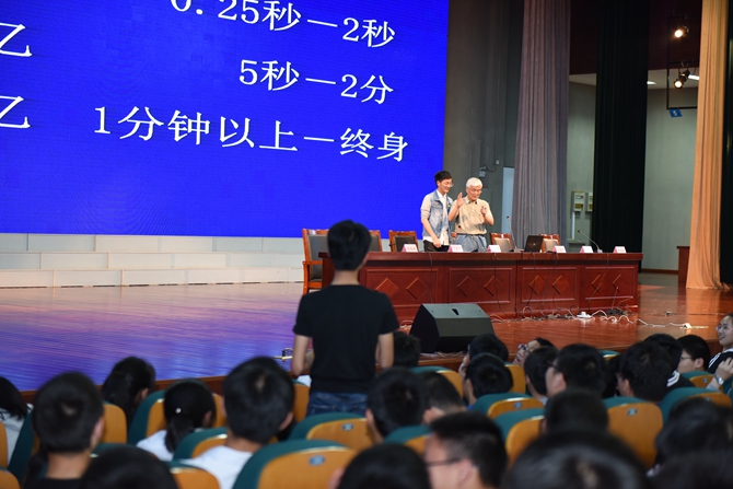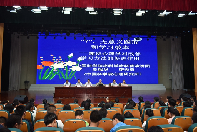 5月22日下午,省市区科协领导陪同中科院吴瑞华教授来到通州高级中学,为高二年级全体师生做了题为“7、无意义图形和学习效率——趣谈心理学对改善学习方法的促进作用”的讲座。 吴教授通过有趣的实例,揭示短时记忆的容量是不能改变,而单元的大小却是可以改变的内在规律,让学生掌握提高学习效率的关键。提醒大家认真观察和发现周围环境中存在的各种类似的心理现象,通过自己深入思考发现事物的规律,并科学运用它们,这对改善学习方法,提高学习效率会起到大的促进作用。