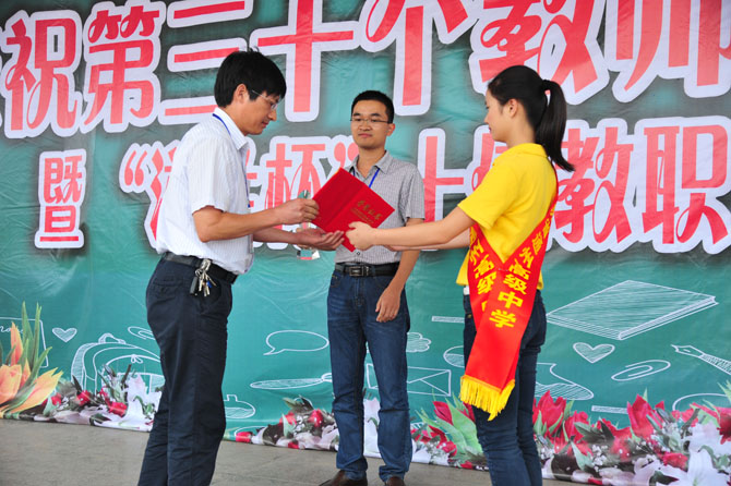 9月10日下午,全体教职员工及全校学生在操场集中,召开庆祝大会暨首届“滋兰杯”十佳教职工表彰大会。整个活动简朴而隆重,首先对十佳教职工进行了事迹宣读和颁奖,精彩的文艺表演穿插其中;随后季仲平校长作了重要讲话,他希望全体教职工向优秀学习,努力使教师节成为盛大的精神节日,增强立德树人、教书育人的荣誉感和责任感,带着教育的远见、智慧和视野以更大的热情投入工作;最后进行的教师集体宣誓,将整个庆祝活动推向了高潮。