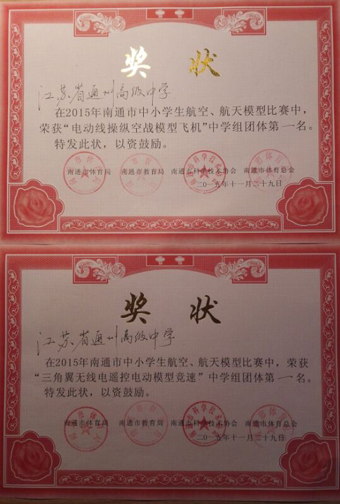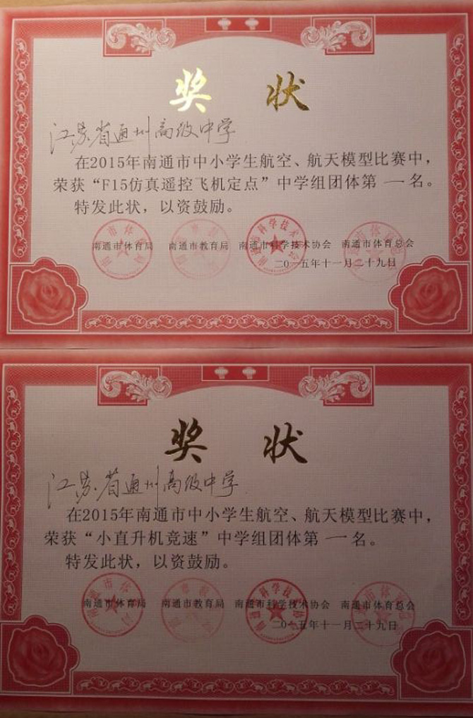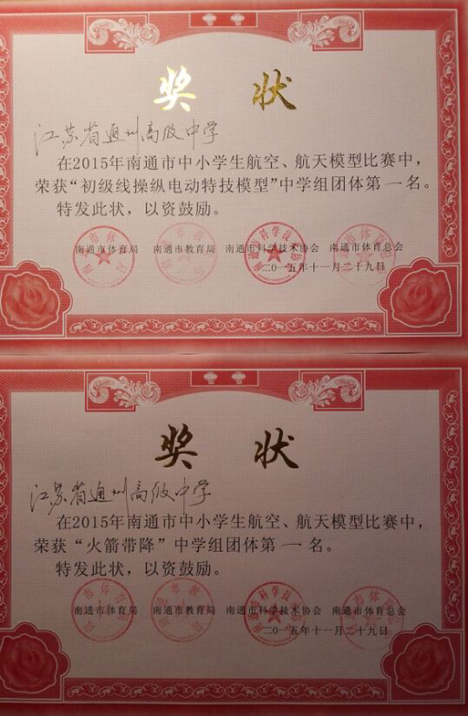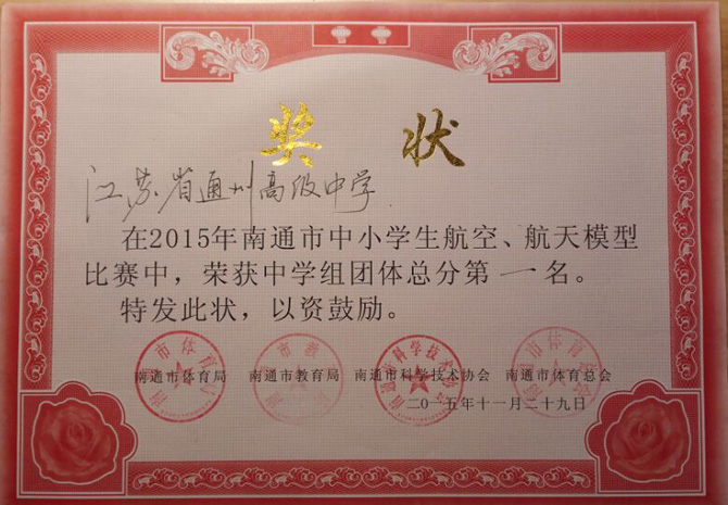 11月28日,在南通市航运学院举行的2015年南通市中小学生航空、航天模型比赛中,我校航模社团在领队许斌副校长、科技辅导员葛犀老师的带领下,不负众望,第十次蝉联中学组团体冠军,在13个单项比赛中共获得8项个人第一名。