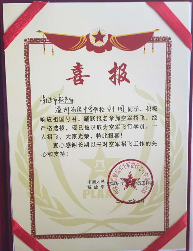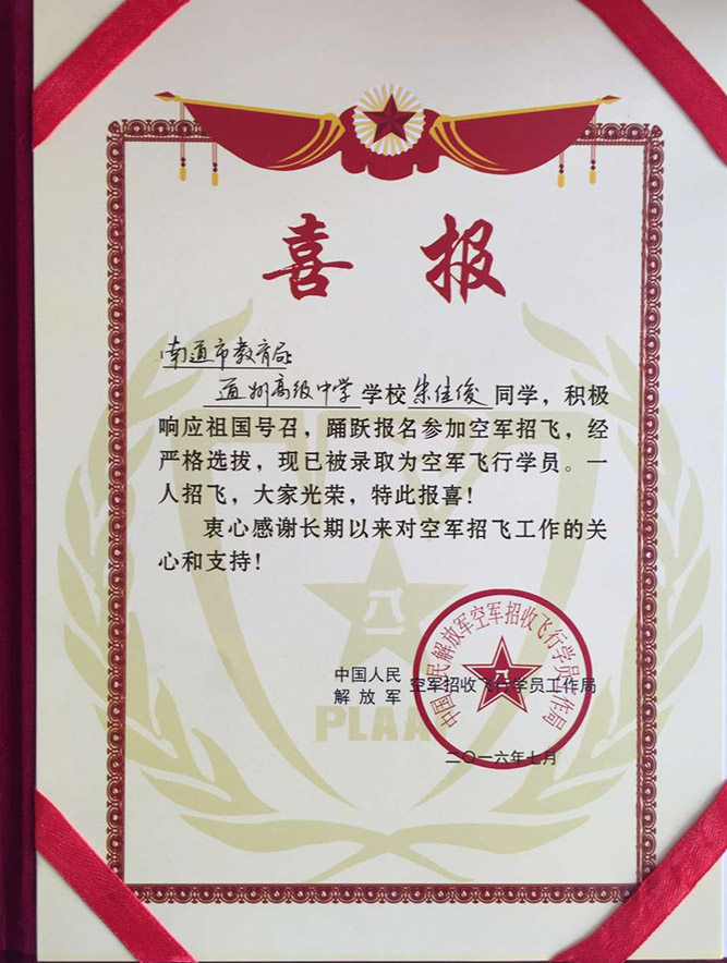 2016年高考我校再传喜报,朱佳俊、刘周同学历经初检、复检、定检多次检查,以优异的成绩和表现得到空军招飞局领导的一致认可,被录取为空军飞行学员;同时,马诚同学被海军航空工程学院录取海军飞行学员。其中,朱佳俊同学以380分的总分列南通市飞行学员之冠。据悉,今年全省空军招飞录取28人,南通市有8名同学被空军招飞局录取,通州中学有2名;海军首次在江苏招飞,共录取21名飞行学员,通州中学有1名。通州中学2016高考招飞成绩总体优异,受到空军和海军招飞局的表扬。