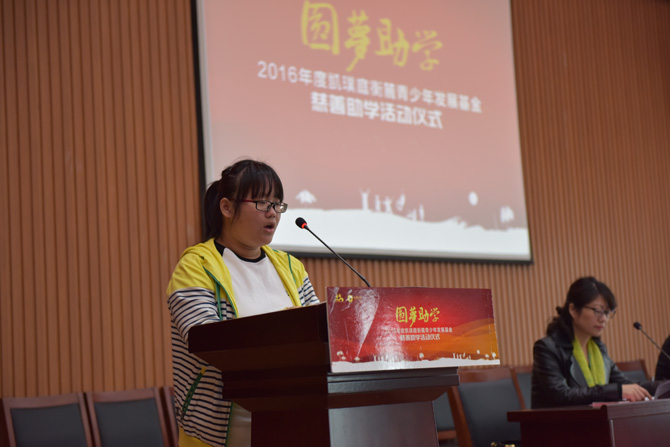 我校高一(2)班秦甜同学作为受助学生代表发言,她在发言中表示,一定会怀着感恩之心牢记使命努力学习,在将来走上工作岗位后把自己获得的关爱转为更强大的能量回报社会。从2016年起,凯璞庭衡麓青少年发展基金对新录取通州区四所高中的优秀贫困生进行资助,明确在每所高中资助10人,每人每年资助1000元生活费,从高一开始直至学生毕业。