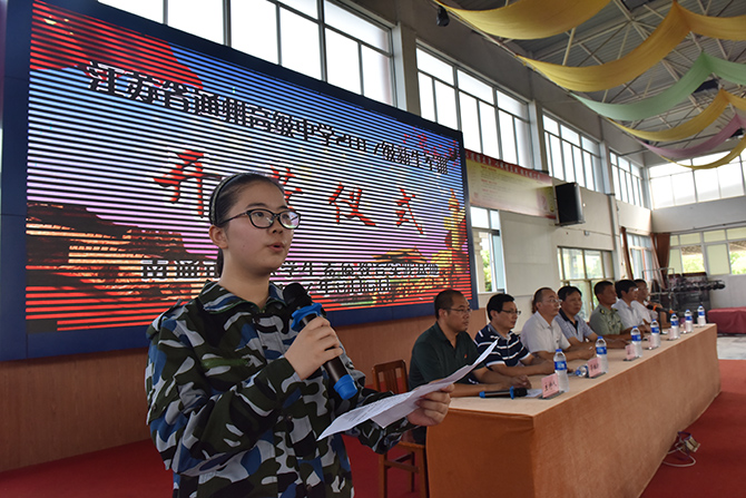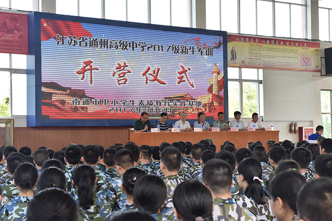 8月6日,我校2017级高一新生军训活动在南通市中小学生素质教育实践基地举行。下午三点,嘹亮的国歌声拉开开营仪式的帷幕,学校党委书记曹光明、副校长秦志强、政教处主任管维新、政教处主任助理王建军以及军训基地主任潘卫成、军训大队长孟行等领导出席了开营仪式。