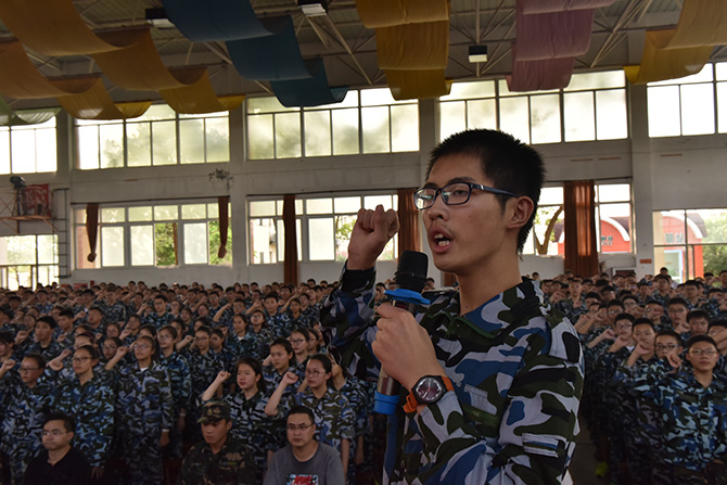 六中队吴争同学代表发言,她说虽然走出空调房不易,但担大任必须有强健的体魄,军训使肉体痛苦的同时,会带来坚强的意志。她代表全体同学承诺:一切行动听指挥,努力完成规定任务,虚心向教官学习,努力学习国防知识,做好内务等工作。