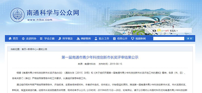 8月15日,首届南通市青少年科技创新市长奖评审结果正式出炉并对外公示,我校师生获得表彰。
